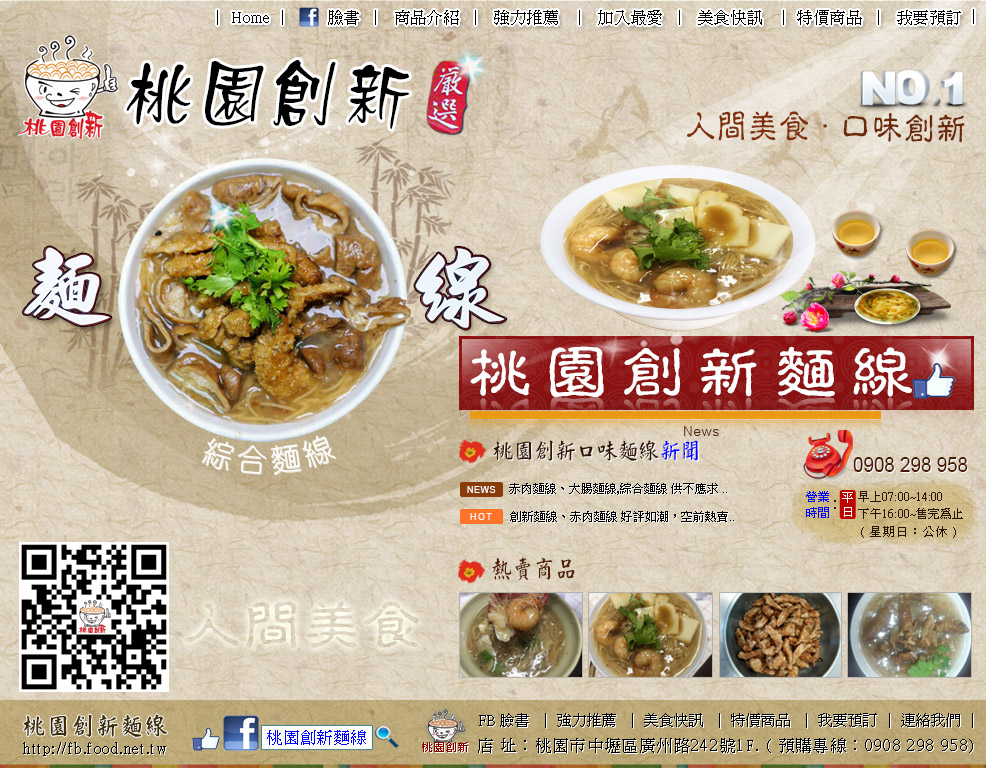 http://fb.food.net.tw Fb 桃園創新麵線,加入最愛 美食快訊,News,美食新聞 桃園創新麵線 http://fb.food.net.tw,中壢麵線 QR-code ,http://fb.food.net.tw Fb Fb 線上訂購 線上訂購 E-Mail 美食快訊,News,美食新聞 特價商品,特價麵線 所有商品介紹 強力推薦麵線 熱賣商品 綜合麵線 鮑魚蝦仁麵線 營業時間